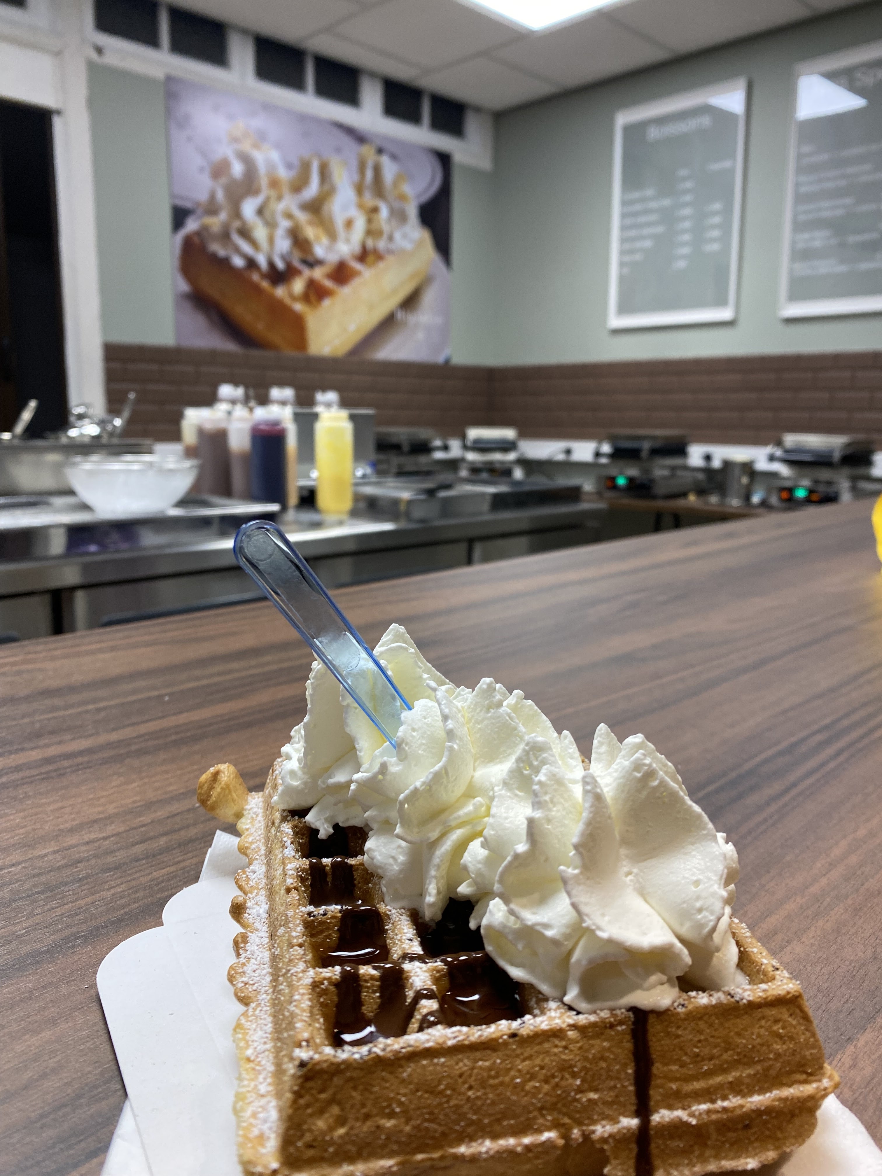 Super bonne gauffre avec un large choix de toppings Patron sympa
