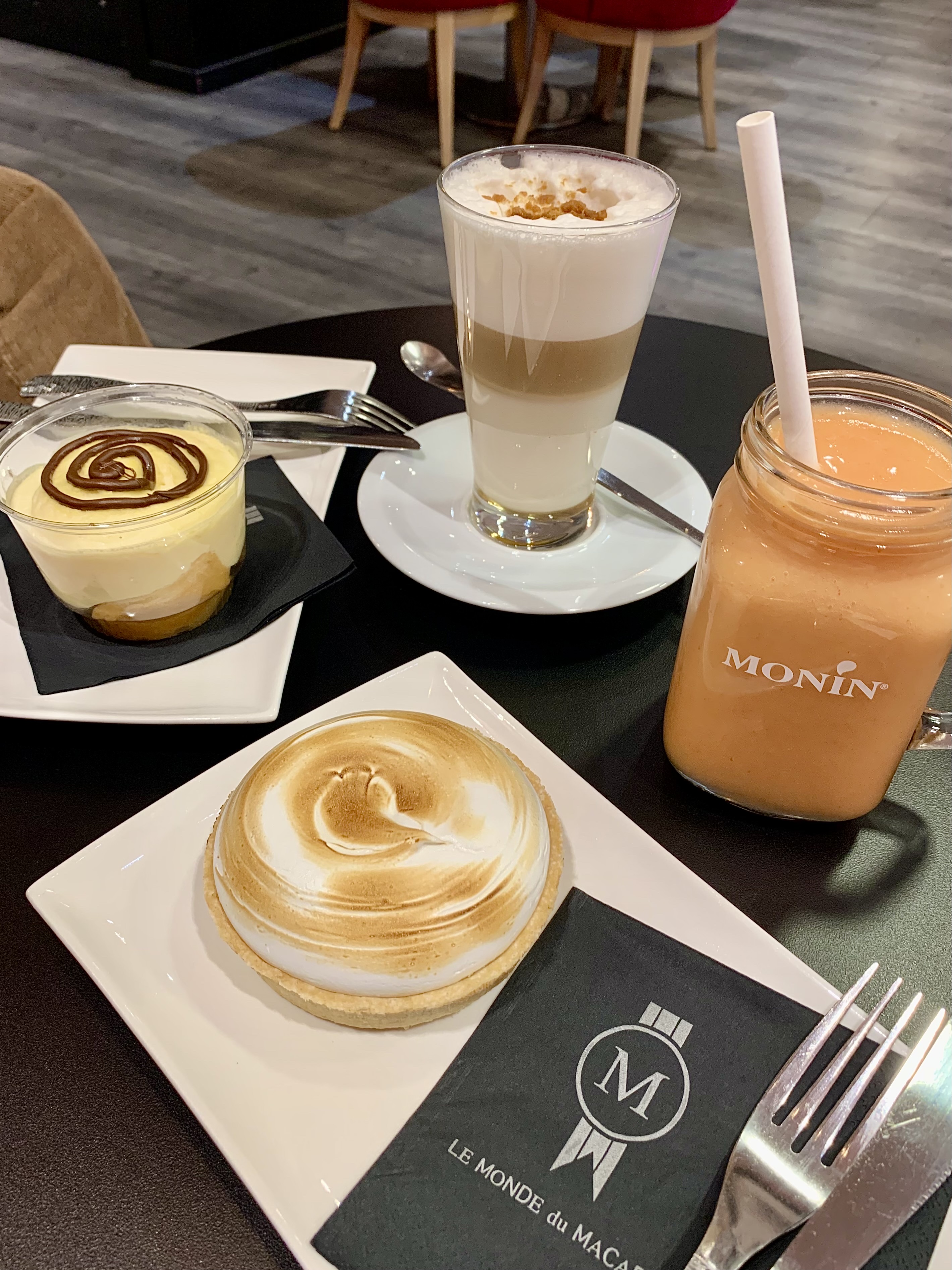 De délicieux cafés, milkshakes, boissons et plein de douceurs, biscuits, gâteaux, nougat, caramel et bien sûr plein de macarons