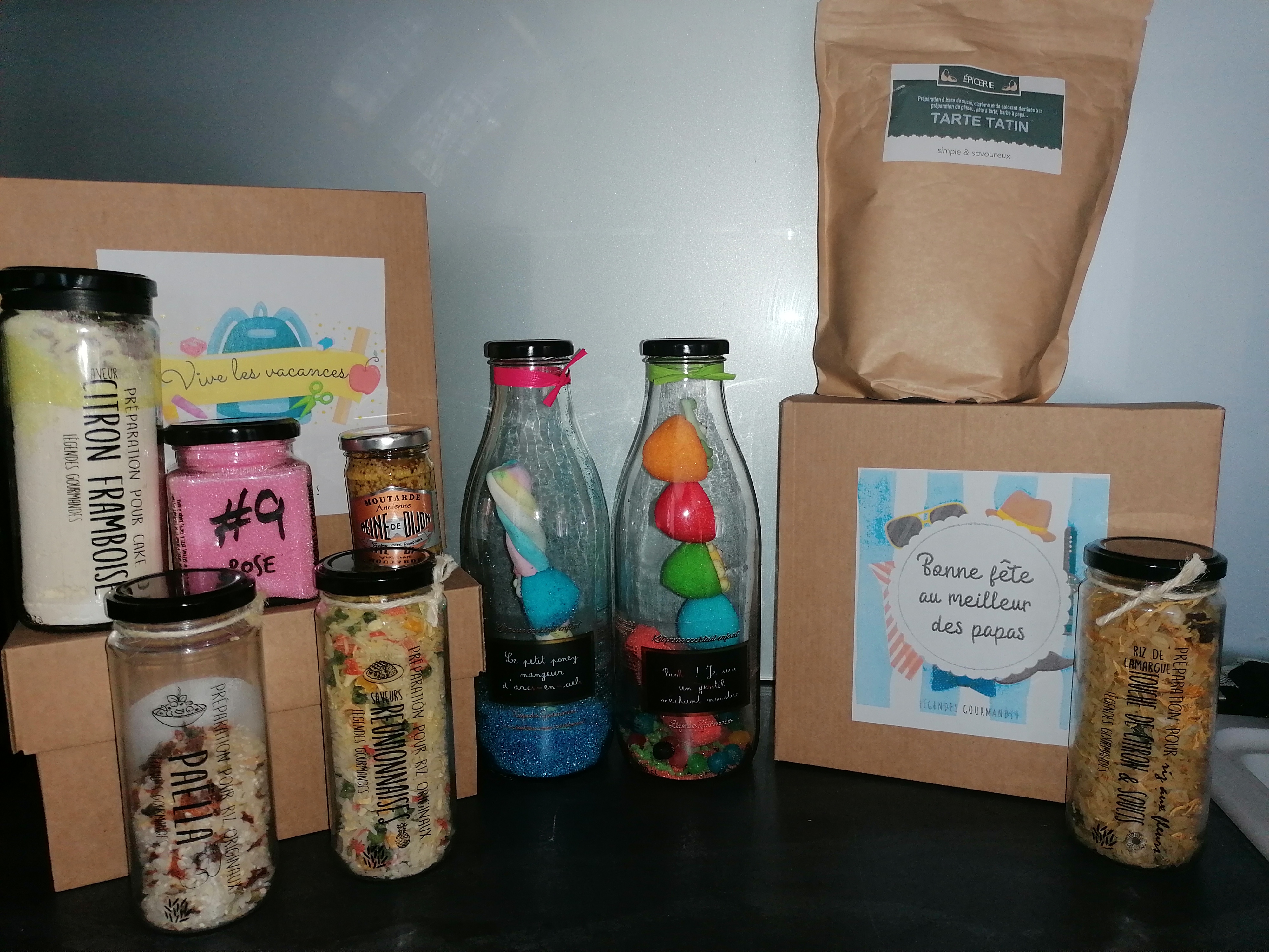 Plein de préparation qui donne l'eau à la bouche. Rhum arrangé, riz et semoule aux lait à différents parfums, centre de table en bonbons, préparation pour faire des barres de céréales, préparation pour cookies etc.......